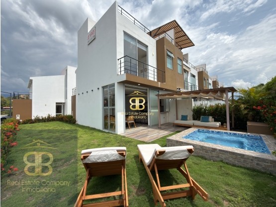 Se vende hermosa e iluminada casa en Melgar Tolima, Vía a Carmen de Apicalá, vereda Chimbí, con una área construida de 154 mts y 195 mts de lote, la distribución de esta casa esquinera te sorprenderá. En ella encontrarás  tres habitaciones con baño privado, principal con walking closet y balcon, sala comedor, cocina abierta, amplia y equipada, zona de lavandería independiente, estudio, tres baños competos y uno social, parqueadero doble y cubierto más depósito, jardín interior y jacuzzi.